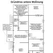 Come si può vedere nella planimetria, l'appartamento inferiore ha una spaziosa cucina con un grande tavolo da pranzo accanto al camino e un ampio soggiorno con camino - ciascuno con accesso a una delle tre terrazze.